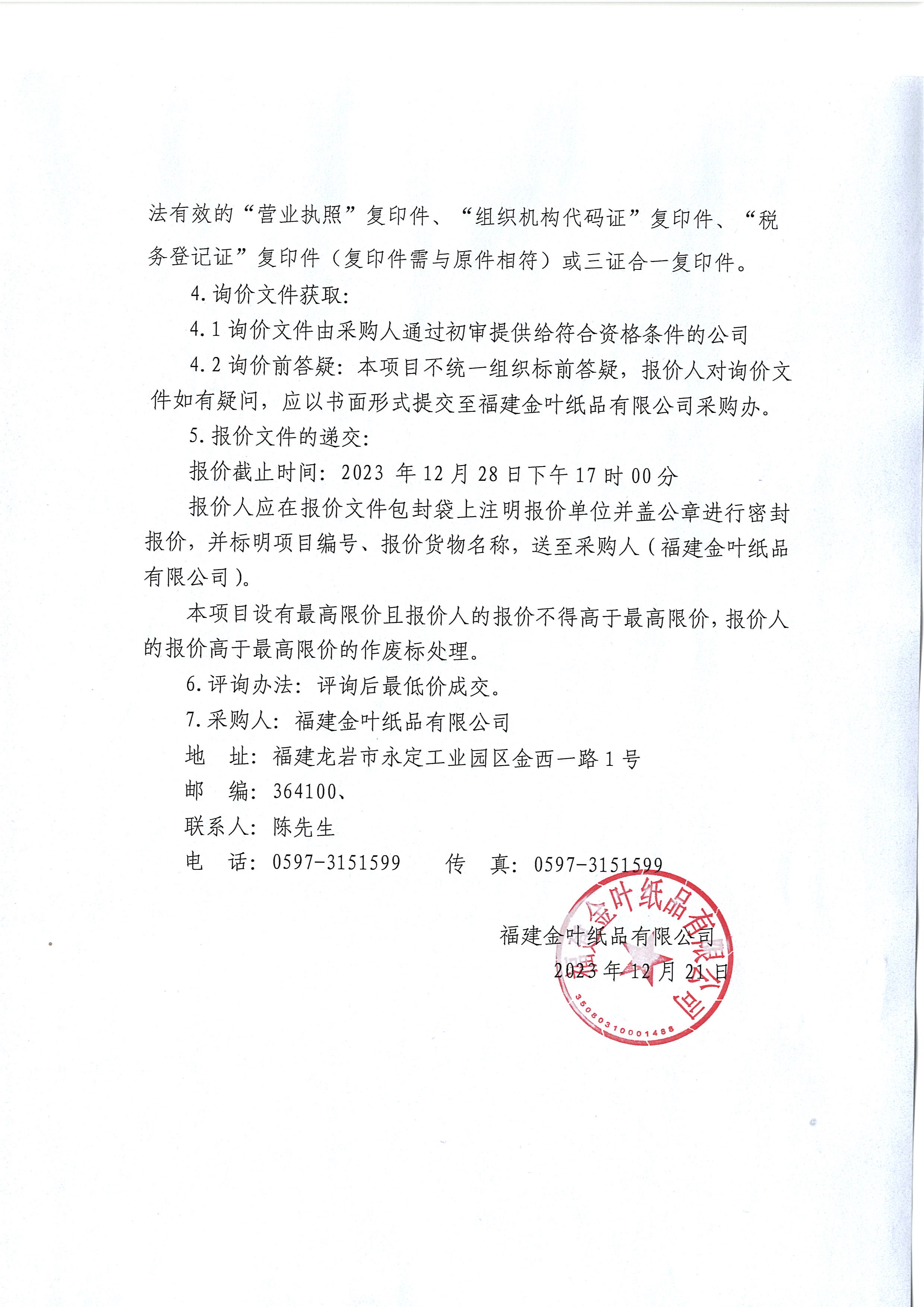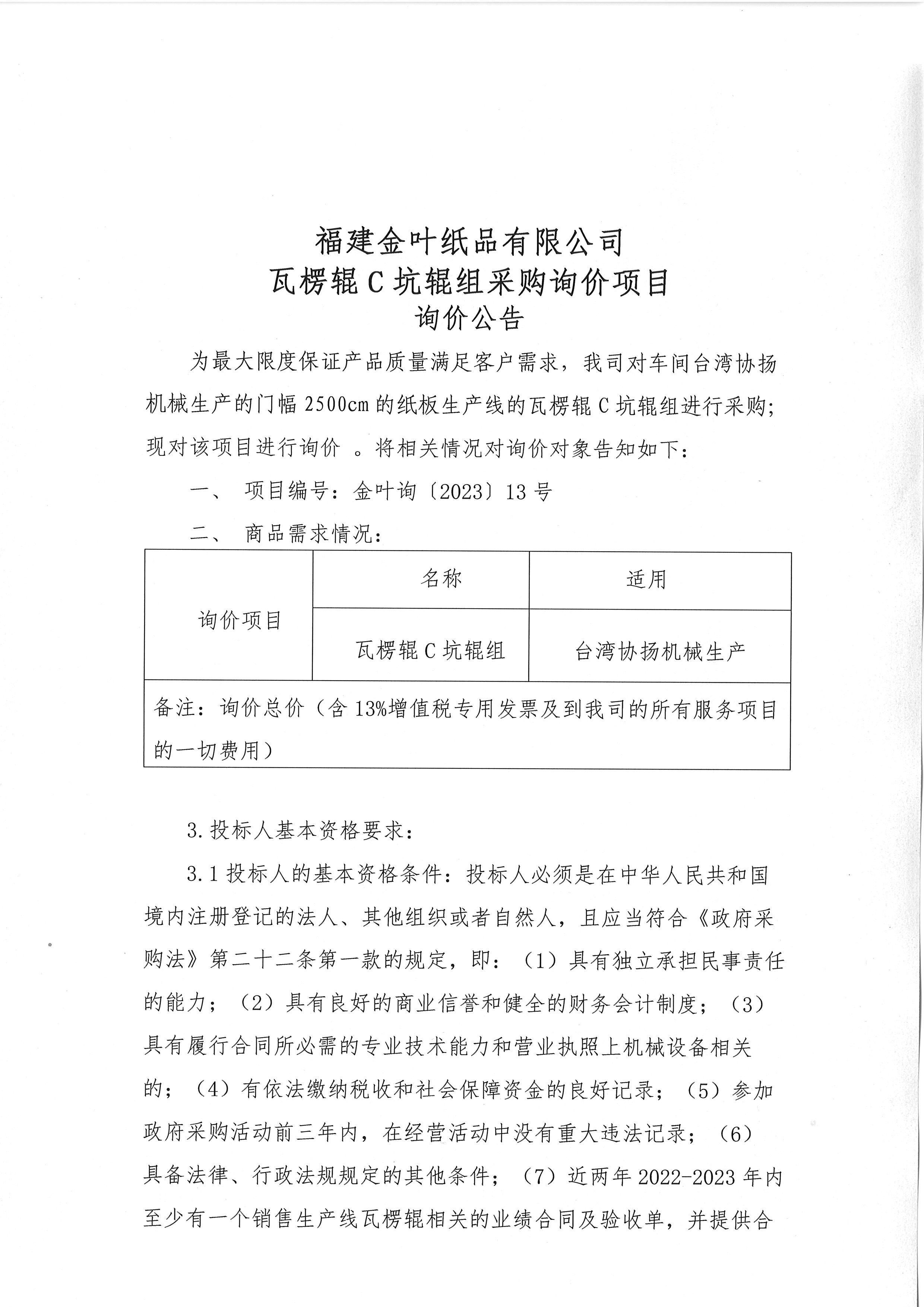 福建金葉紙品有限公司瓦楞輥C坑輥組采購(gòu)詢價(jià)項(xiàng)目