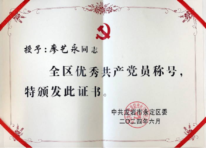 在慶祝中國共產黨成立103周年之際,為選樹典型、表彰先進、弘揚正氣,動員和激勵廣大黨員和各級黨組織不忘初心、牢記使命,見賢思齊、踔厲奮發,永定區委表彰了一批全區優秀共產黨員、優秀黨務工作者和先進基層黨組織。我廠黨員廖藝永同志榮獲“全區優秀共產黨員”稱號。